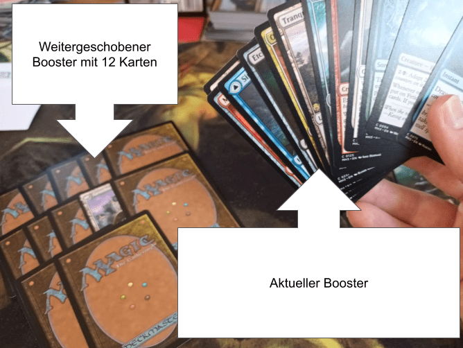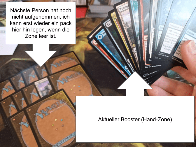 Es gibt von jeder Person aus drei Zonen wo sich Karten aufhalten dürfen, die noch nicht gepickt worden sind: In der Hand der gerade pickenden Person, zur einen Seite der Person die Karten, die weitergegeben wurden, zur anderen Seite der Person der nächste Booster, der kommt. In jeder dieser Zonen darf maximal 1 Booster sein! Wenn die nächste Person noch nicht aufgenommen hat, wird gewartet bis sie soweit ist. Das dauert nicht länger als wenn mans nicht macht, ein Draft dauert immer so lange wie die langsamste Person draftet.